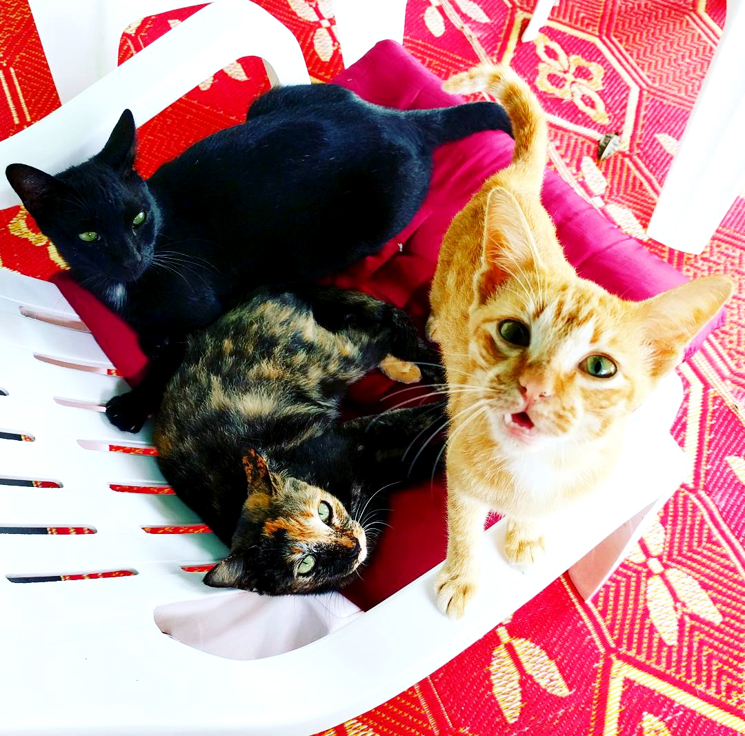 This family of three here has taken up residence at my bungalow and, without fail, they follow me wherever I go… inside, outside… and they’re usually yelling at me about something (if only I knew what). There’s a second kitten who belongs to this group, but she shacks up somewhere else. Family drama, I guess.